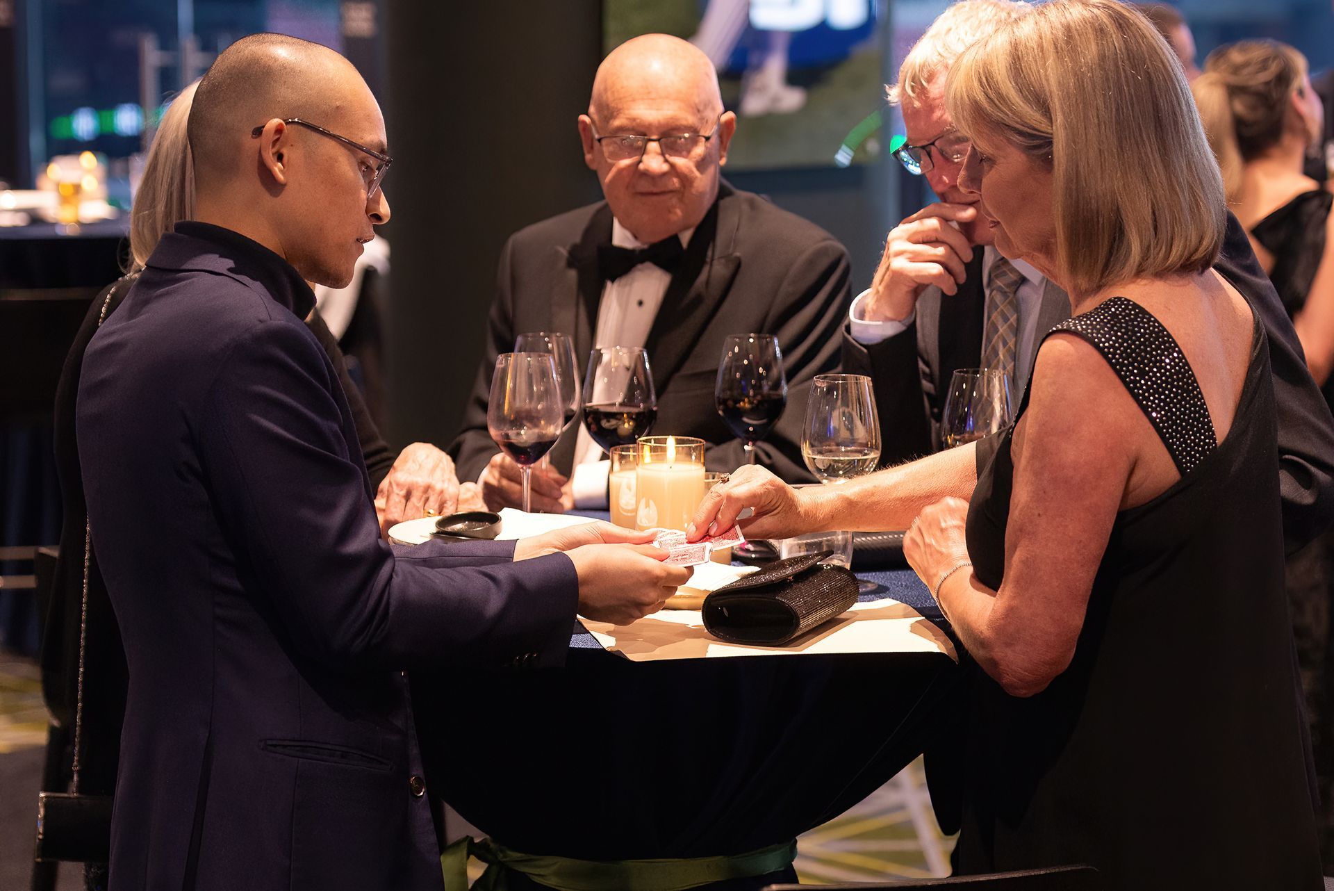 Perfect for cocktail hours, networking events, gala dinners, and intimate celebrations, our close-up magic blends seamlessly into your event while elevating the atmosphere with polished professionalism and engaging charisma.